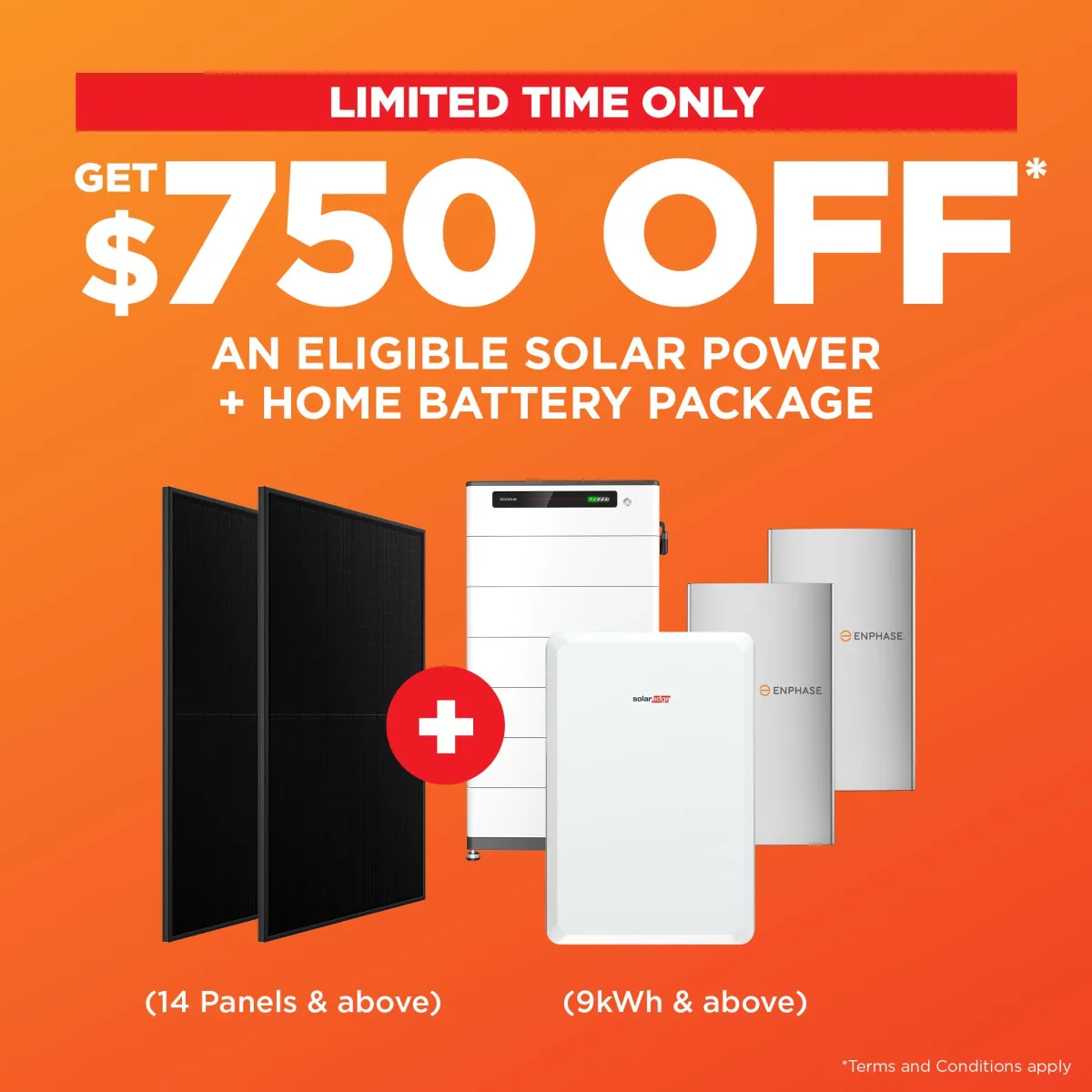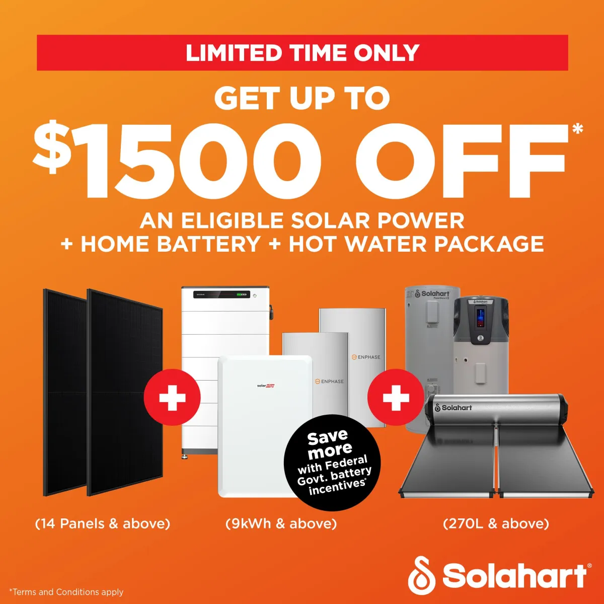 *$750 is given as a point-of-sale discount with the purchase of a package deal that includes an eligible Solahart Solar Power system (14 panels and above) together with an eligible Home Battery (9kWh and above) in one transaction. Other costs may apply. Get a total of $1500 given as a point-of-sale discount if you add a 270L and above Solahart water heater to the package deal in the same transaction. Offer not available in the NT. Limit of one discount offer per household during the promotion. These Solahart offers are available from 01/07/2025 until 11.59 pm AEST on 31/08/2025, are subject to stock availability, and exclude commercial installations. Participating Solahart Dealers only. Not available in conjunction with any other offer unless otherwise stated. For full details, visit solahart.com.au/promotions.