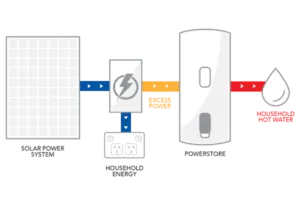 A Solahart PowerStore® system takes excess energy from your solar power system and uses it to gradually heat water, rather than allowing it to be fed back into the grid. Like a battery, it stores energy – but it’s more affordable.